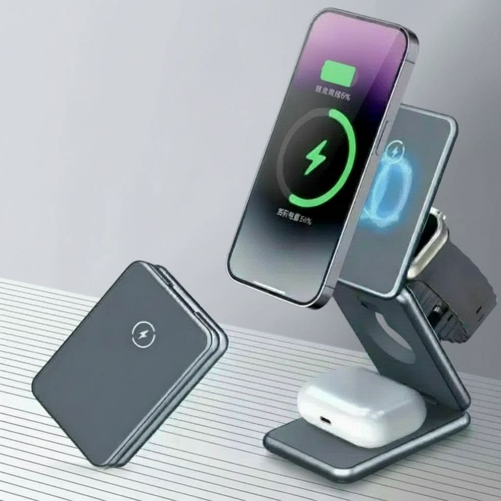 Su diseño minimalista 3 en 1 te permite cargar simultáneamente tu smartphone, smartwatch y auriculares, todo en un solo espacio limpio y ordenado.